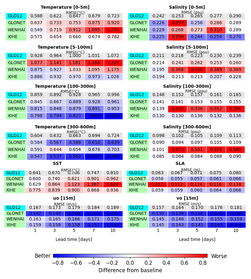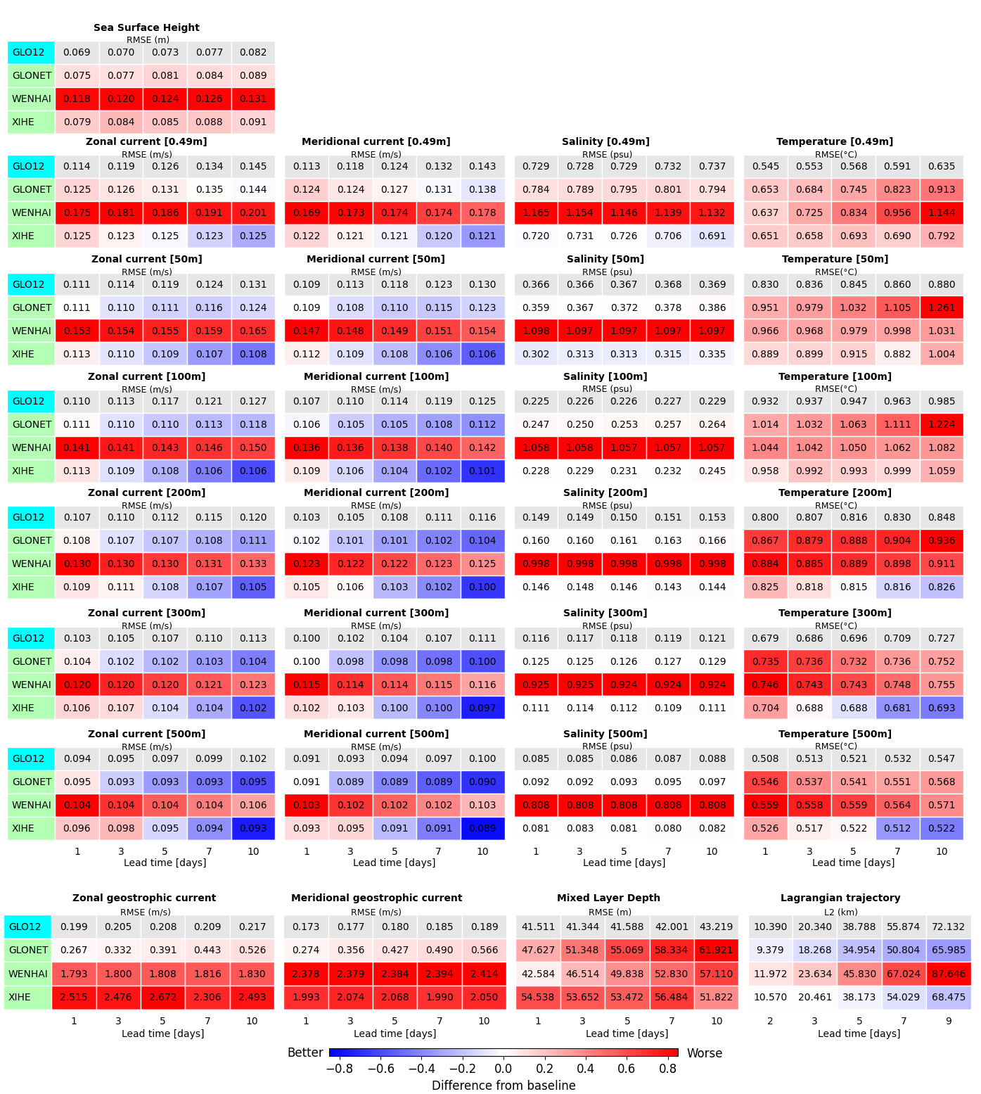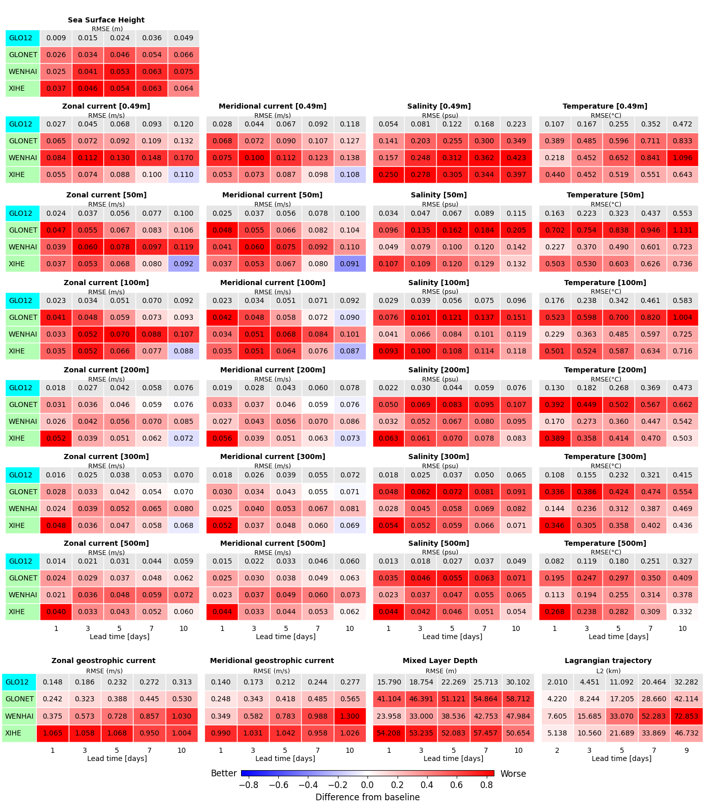 Evaluating ocean forecast performance is a complex task, as different users have varying priorities. Some may focus on accurate predictions of currents, while others prioritize sea level or salinity forecasts. To accommodate these diverse needs, OceanBench provides a comprehensive set of metrics. Please keep in mind that these metrics capture key aspects of forecast quality rather than the complete picture.